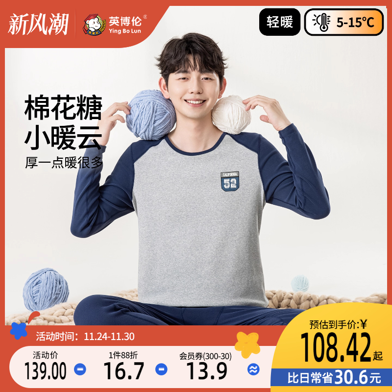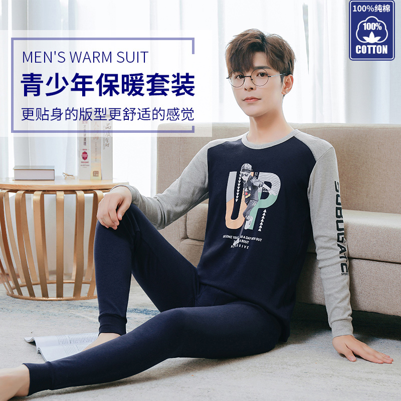 英博伦青少年内衣套装男士纯棉保暖学生圆领打底衫男大童秋衣秋裤