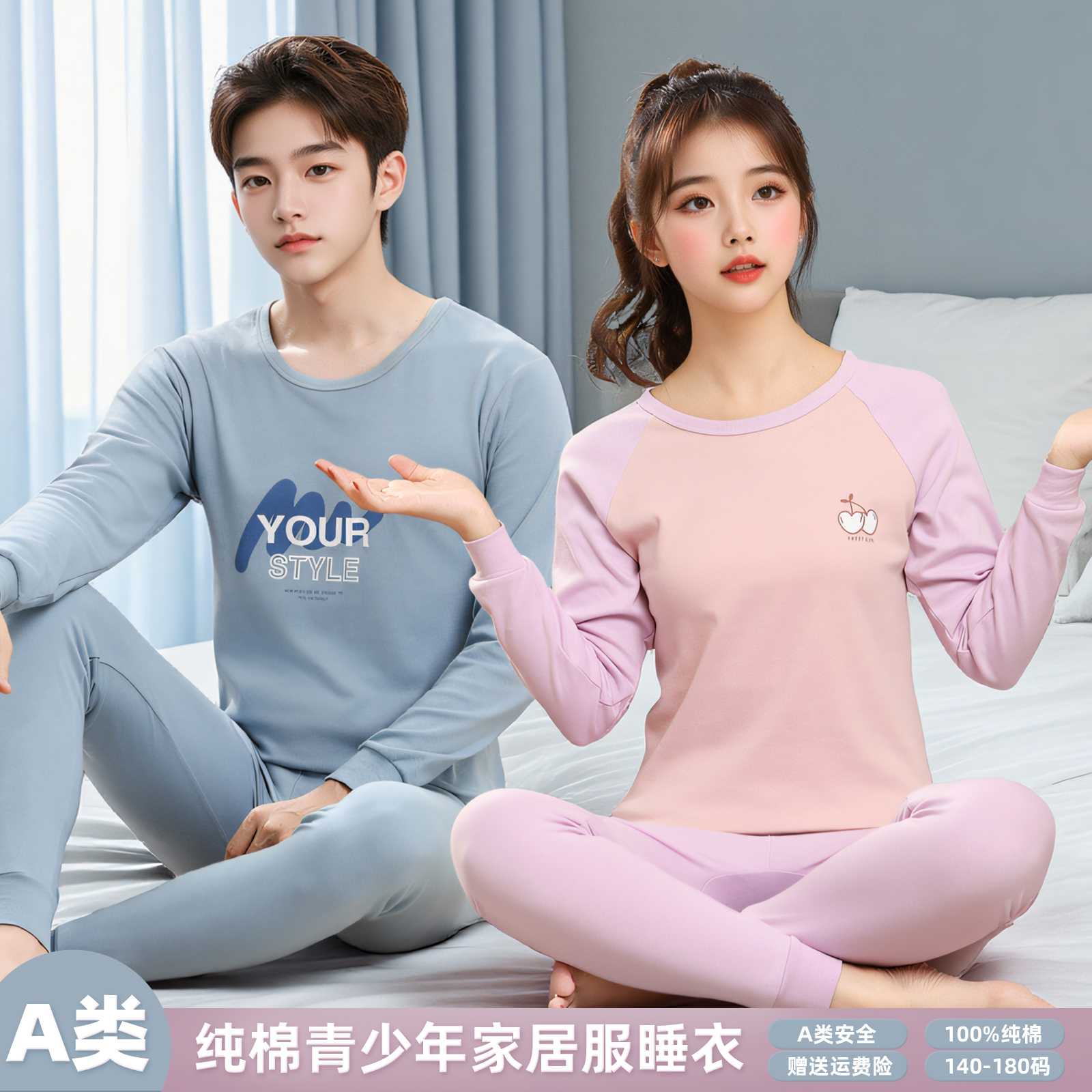 A类纯棉青少年内衣套装 春秋款秋衣秋裤 男女童长袖家居服 100%棉