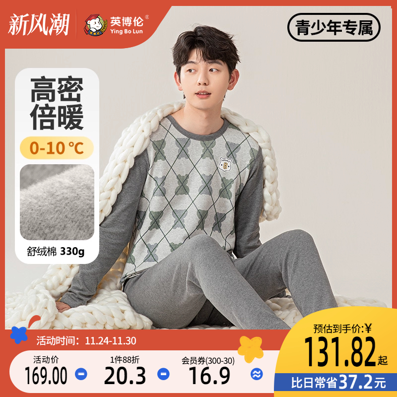 英博伦青少年内衣套装纯棉a类男睡衣冬季加厚保暖男大童秋衣秋裤