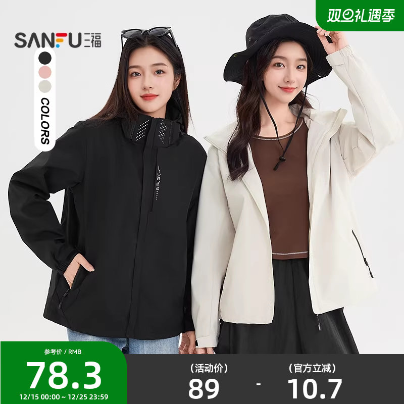三福冲锋衣女款2025新款夏季可拆卸连帽户外宽松黑色外套上衣女装