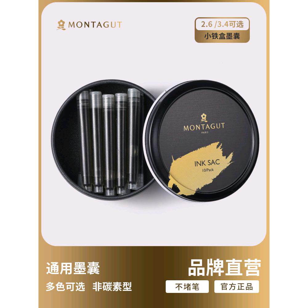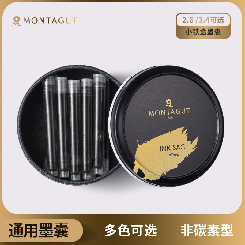 法国梦特娇10支装钢笔墨囊墨水胆纯蓝墨兰黑色学生正姿练字用换墨囊3.4mm2.6mm通用可替换多功能可收纳小铁盒