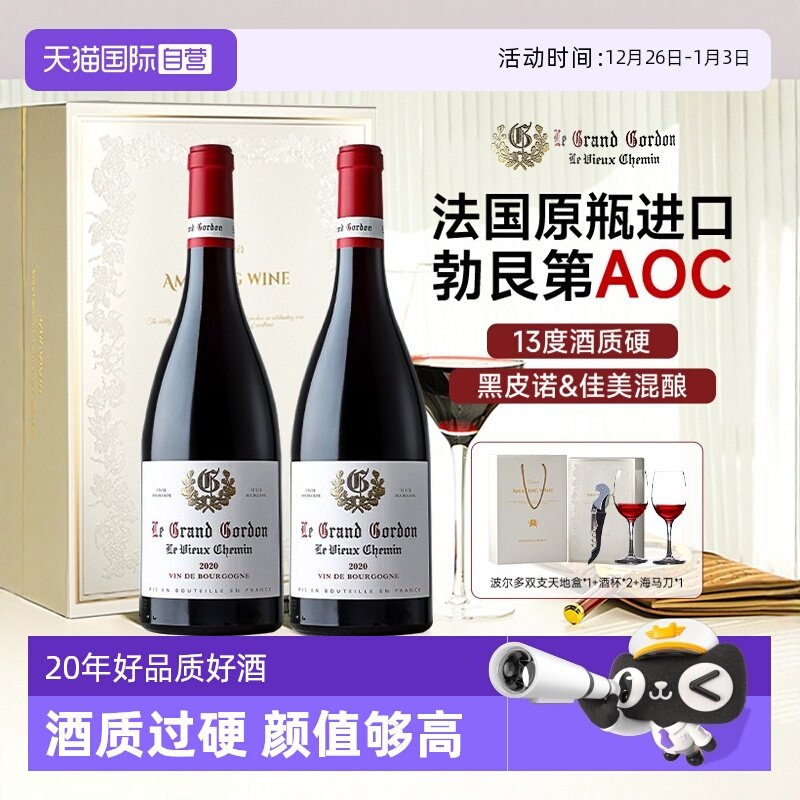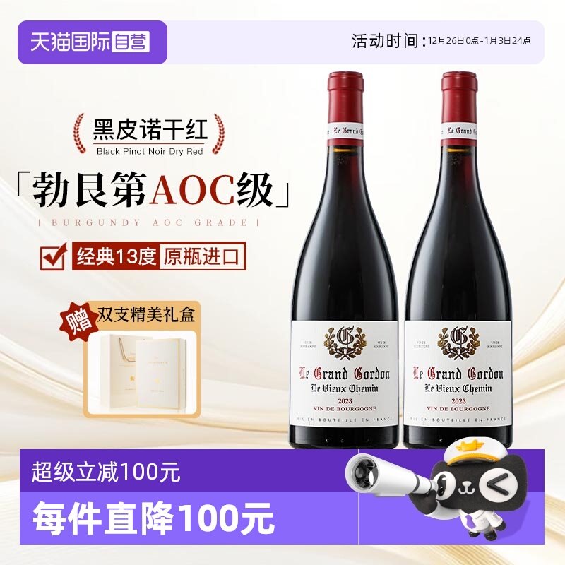 【自营】法国红酒勃艮第丘AOC干红葡萄酒黑皮诺葡萄酒2支礼盒装