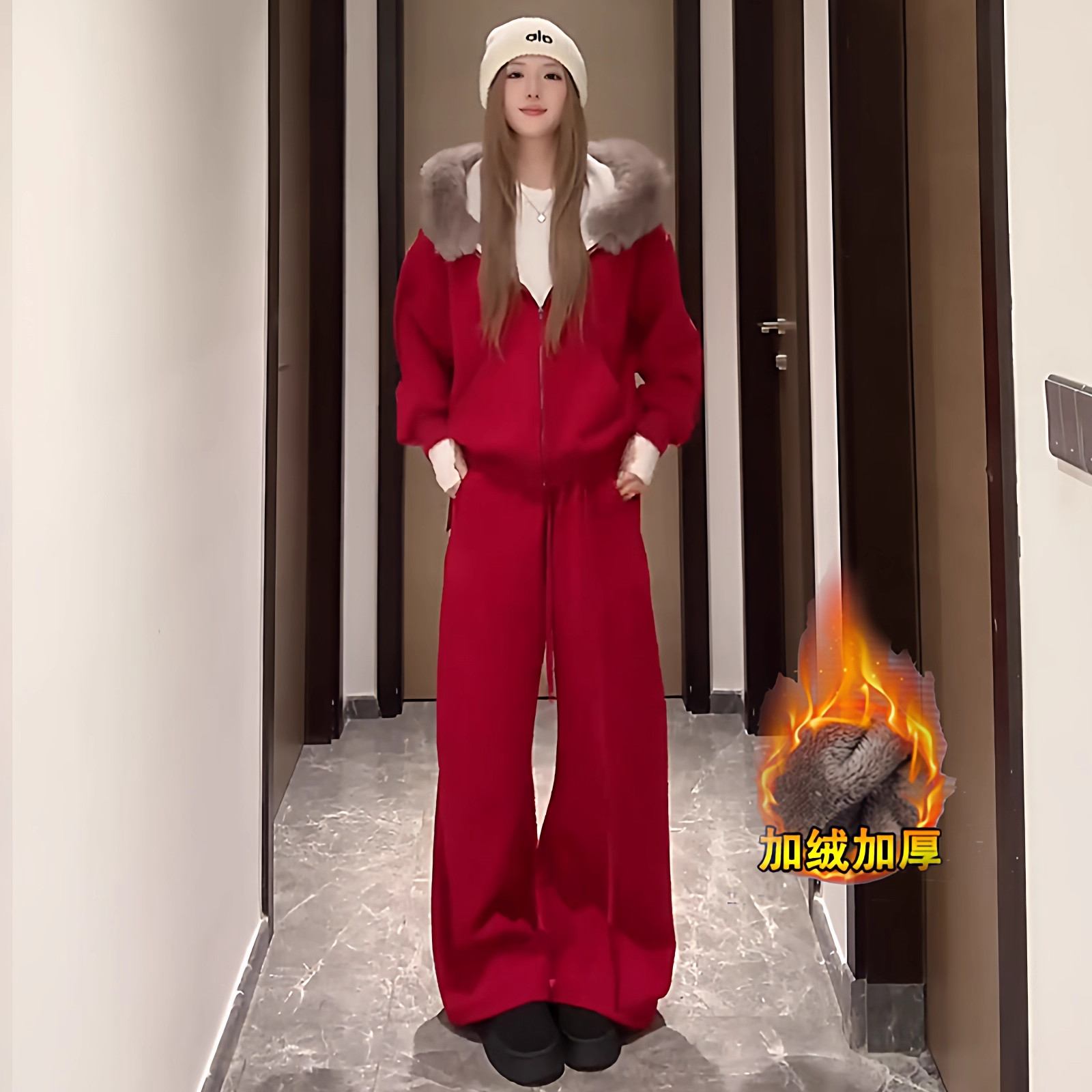 加绒加厚时尚运动套装女冬季新款洋气显瘦连帽卫衣阔腿裤两件套潮