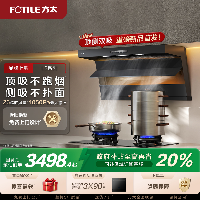 方太L2顶侧双吸抽油烟机燃气灶具套装家用厨房烟灶套餐官方旗舰店
