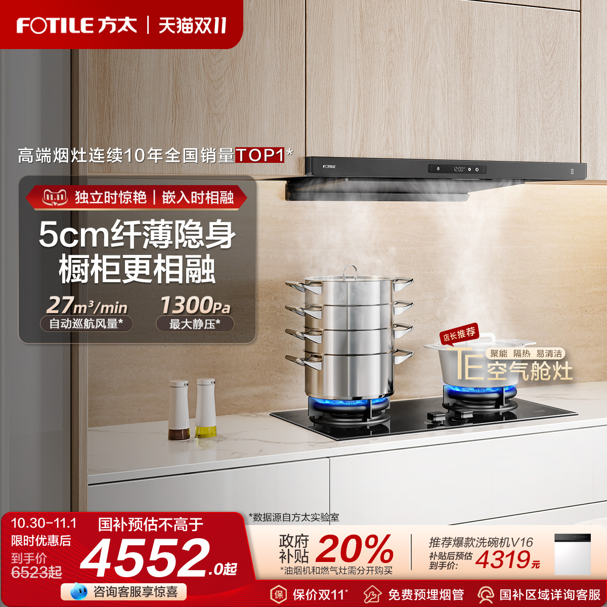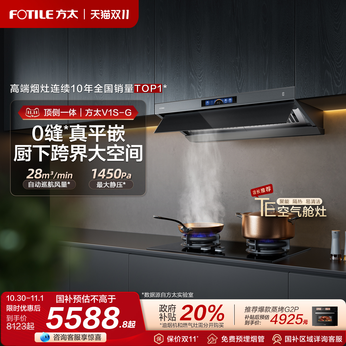 方太V1S烟机灶具套装顶侧一体平嵌抽吸油烟机燃气灶套餐官方旗舰