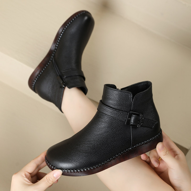 牛筋防滑软底妈妈棉鞋百搭平跟厚底手工复古女士真皮冬季加绒短靴