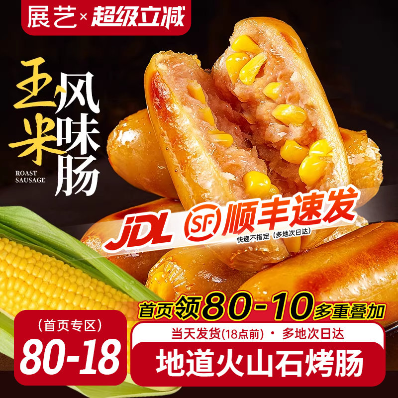 展艺火山石玉米烤肠500g*4袋火山石肠台湾风味地道脆皮黑胡椒肉肠