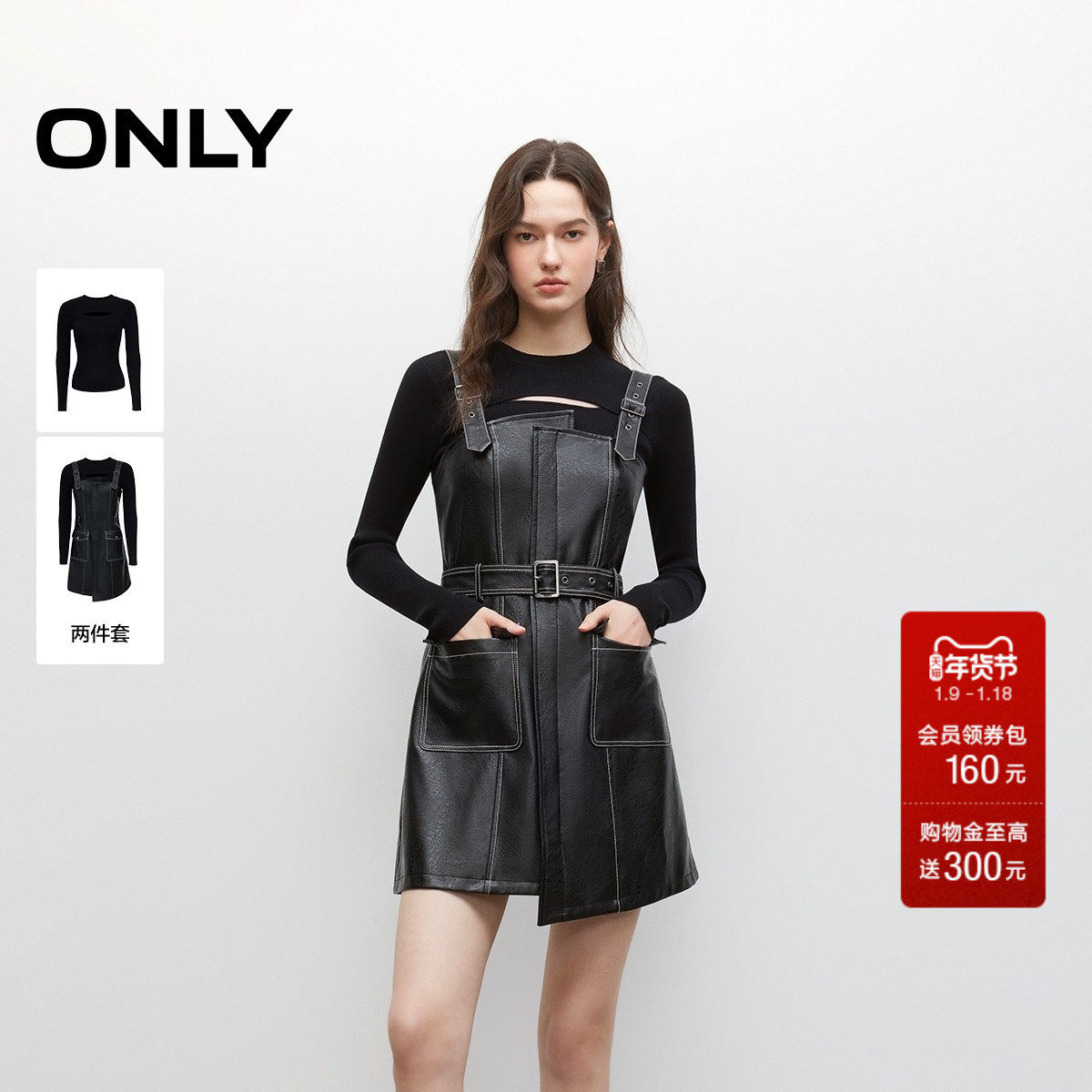 ONLY2025秋季新款性感镂空长袖针织打底吊带PU短裙套装连衣裙女