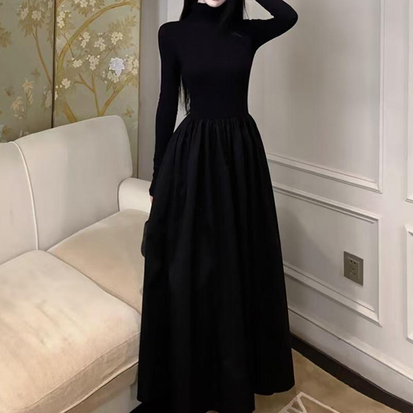 黑色长袖长裙秋冬季风衣内搭打底连衣裙女赫本风小黑裙冬装高级感