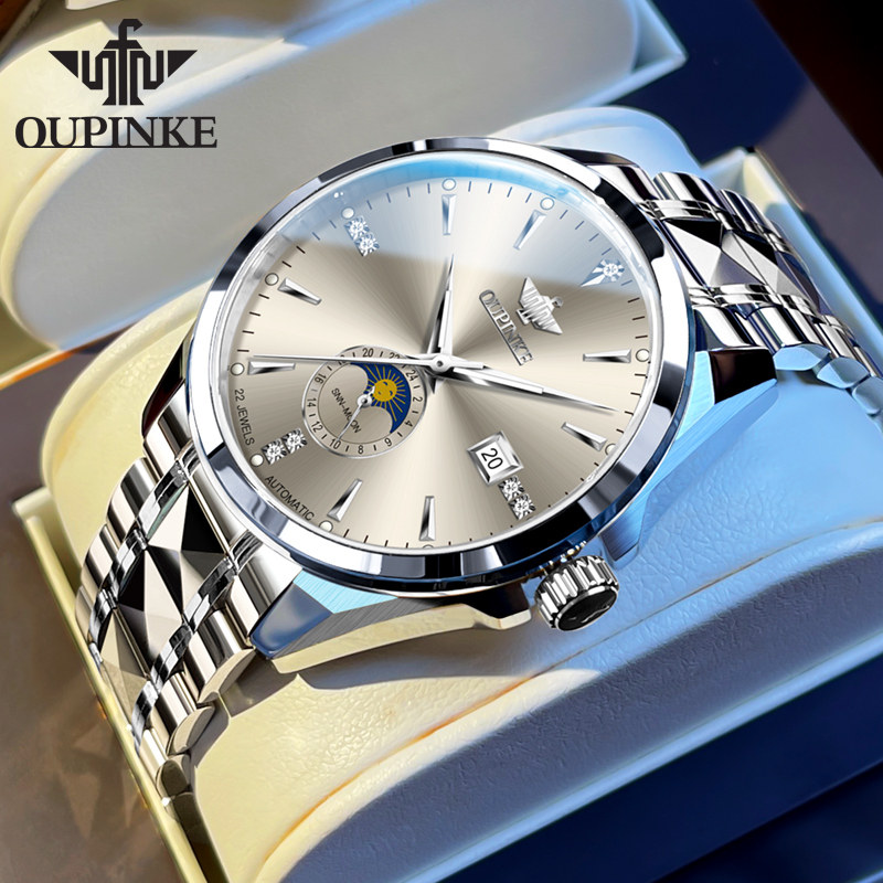 欧品客官方正品男士手表全自动机械表新款钨钢月相防水名品牌腕表