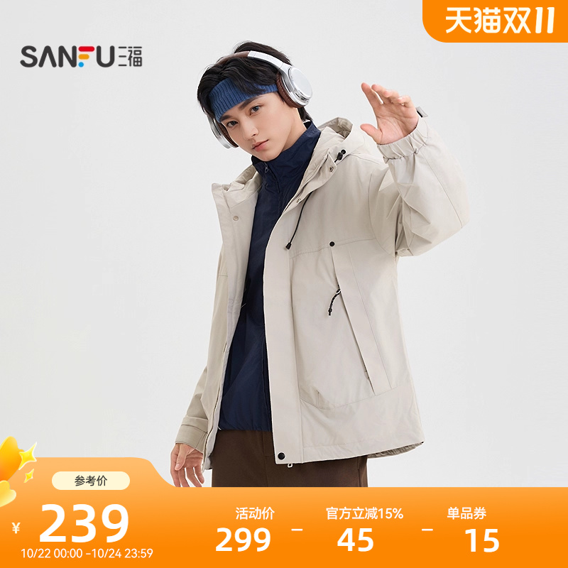 三福2025冬季男士户外抽绳冲锋衣棉衣 宽松连帽保暖外套505922