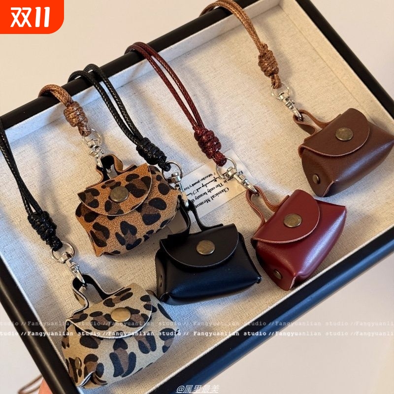 复古皮质挂脖mini耳机包零钱包包女时尚可爱零钱包长款项链配饰