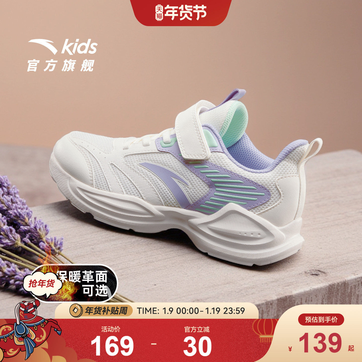 安踏儿童跑鞋女童鞋冬季新款大童跑步运动鞋春秋网面鞋子女孩皮面