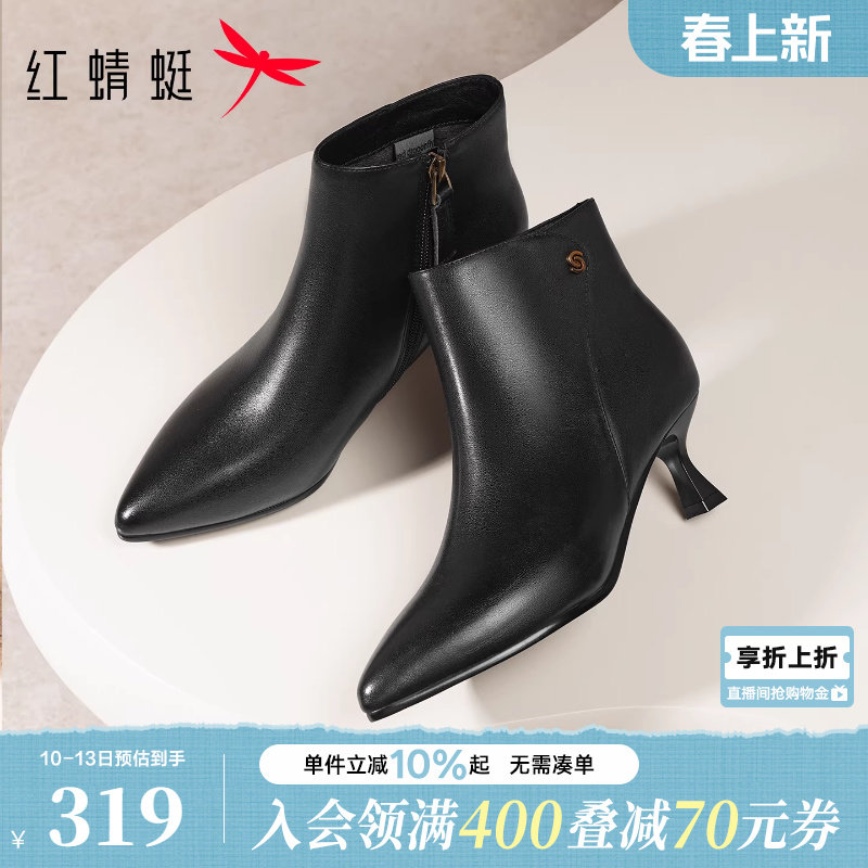 红蜻蜓高跟鞋冬季新款女鞋靴子细跟女士鞋子真皮白色尖头皮鞋女靴