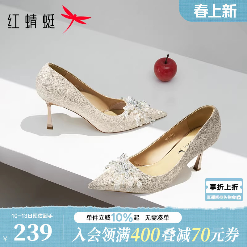 红蜻蜓高跟鞋女主婚鞋新款婚礼女鞋水钻尖头细跟单鞋绝美新娘鞋子