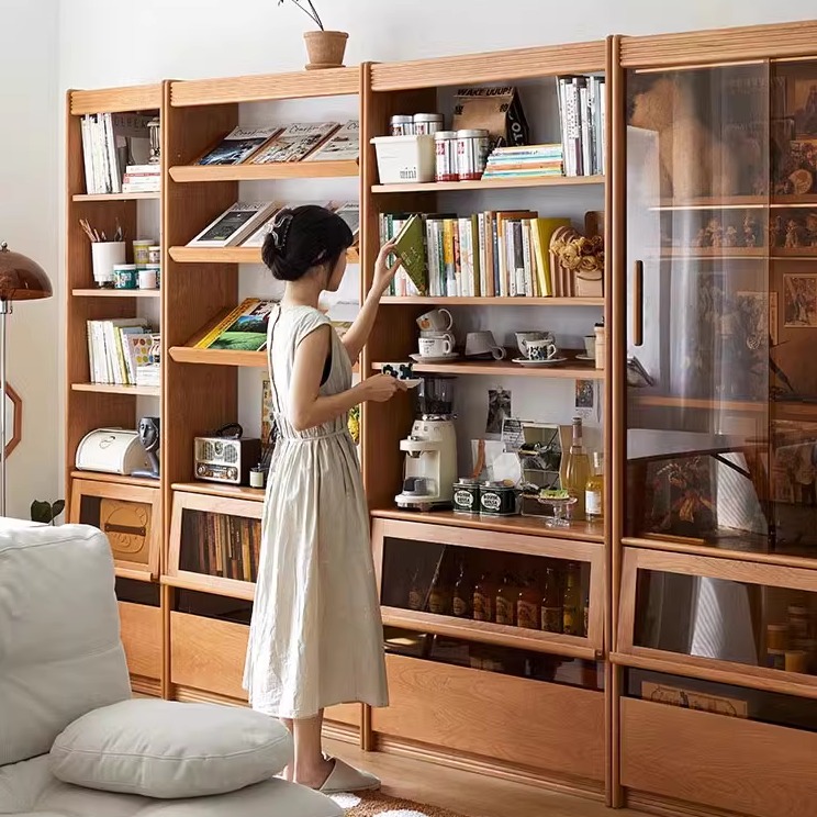 轻奢风书柜落地靠墙现代简约家用实木北欧书架带玻璃门展示柜定制