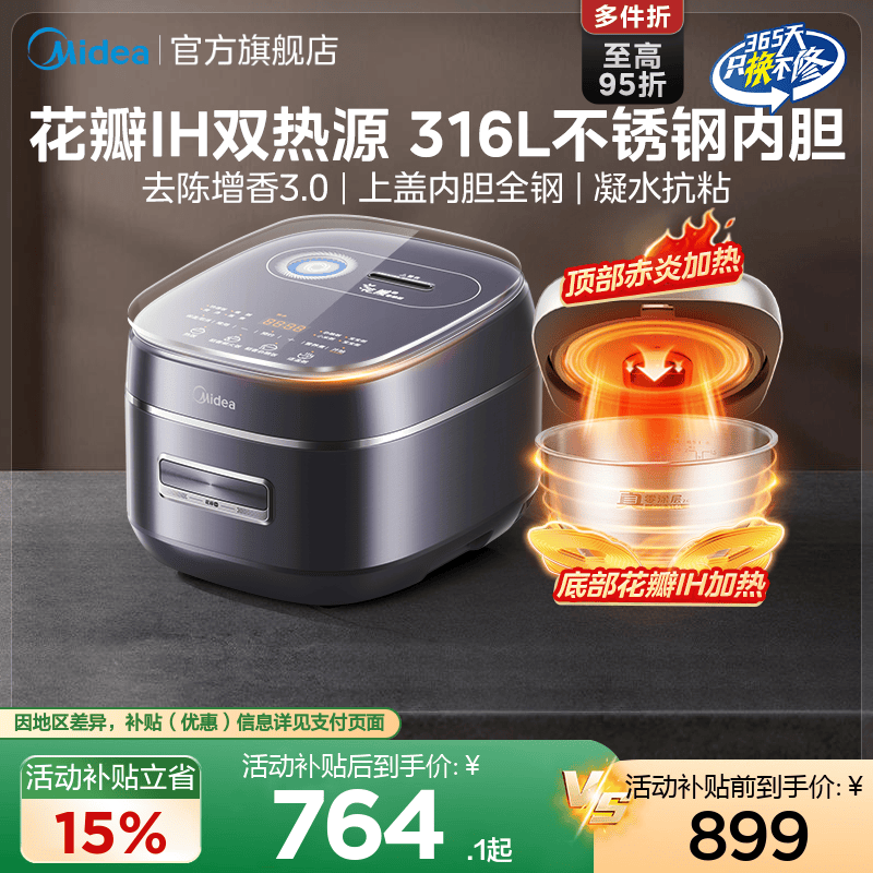 美的花瓣IH有钛电饭煲家用4升无涂层2到3人电饭锅316L钢0涂层正品