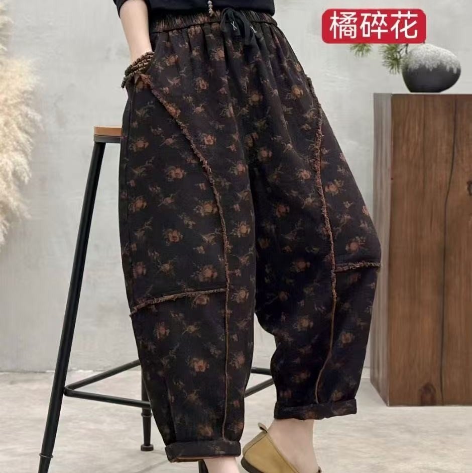 2025秋韩版宽松复古双层纱印花炒色做旧松紧腰哈伦裤九分裤女