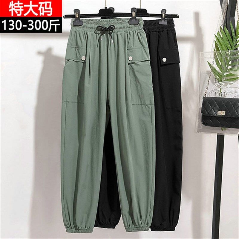 夏 大码230斤胖mm宽松遮肉松紧腰薄款弹力速干休闲哈伦裤九分裤女