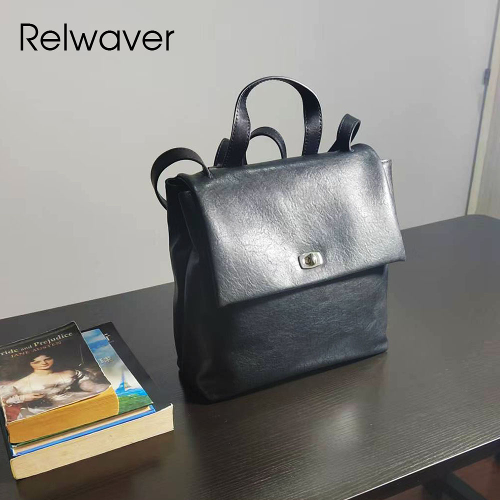 Relwaver真皮多功能双肩包黑色小包时尚潮流女包头层牛皮手提单肩
