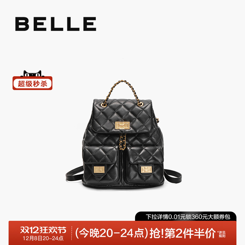 百丽女包质感真皮小香风上班通勤背包羊皮黑色链条双肩包X9330BX4
