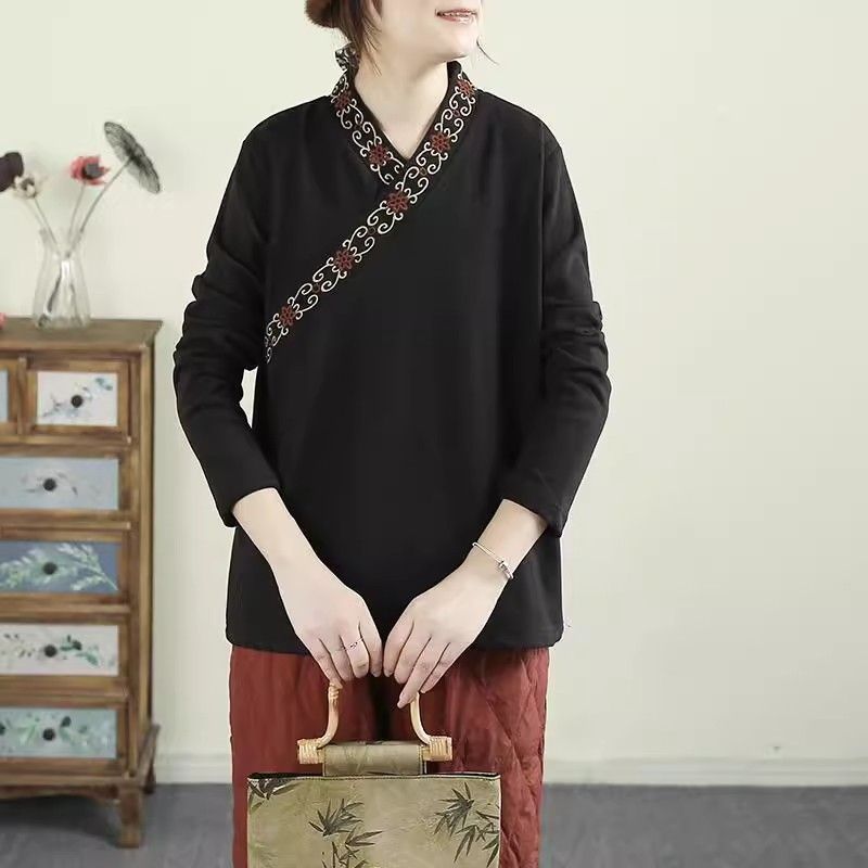 民族风女装上衣新款中国风绣花长袖t恤复古立领刺绣加绒打底衫女