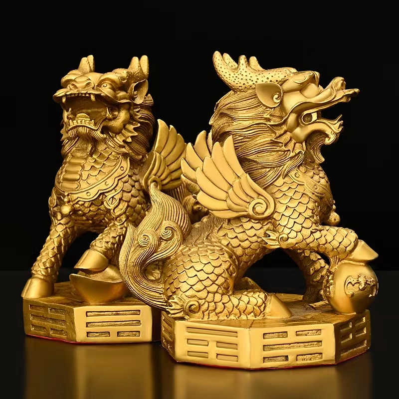 纯铜麒麟摆件一对公母麒麟踩八卦家用办公室装饰品乔迁入户工艺品