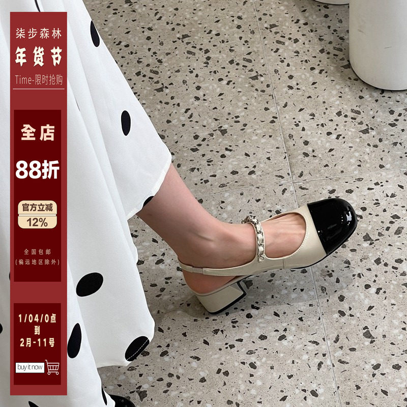 法式复古小香一字扣带玛丽珍女鞋方头浅口粗跟中跟鞋拼色链条单鞋