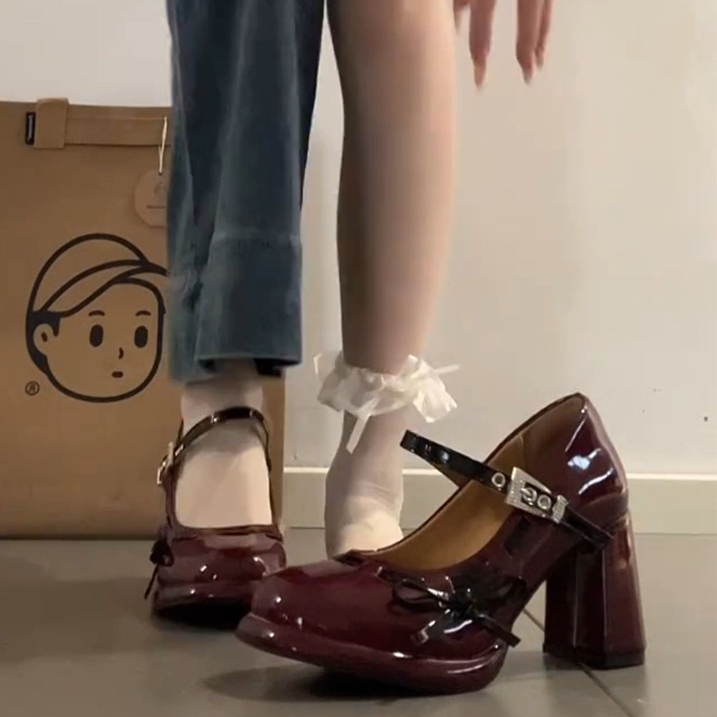 法式复古玛丽珍鞋女2025新款女鞋粗跟高跟单鞋蝴蝶结一字扣小皮鞋