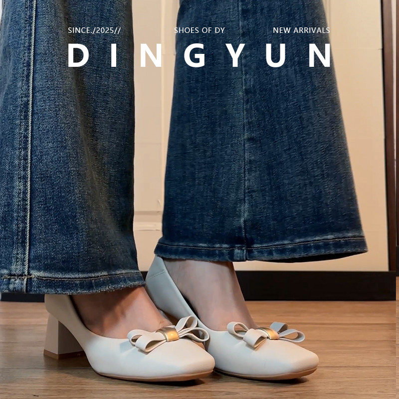 【丁允】气质优雅方头粗跟高跟鞋女金属扣蝴蝶结小香浅口单鞋2026
