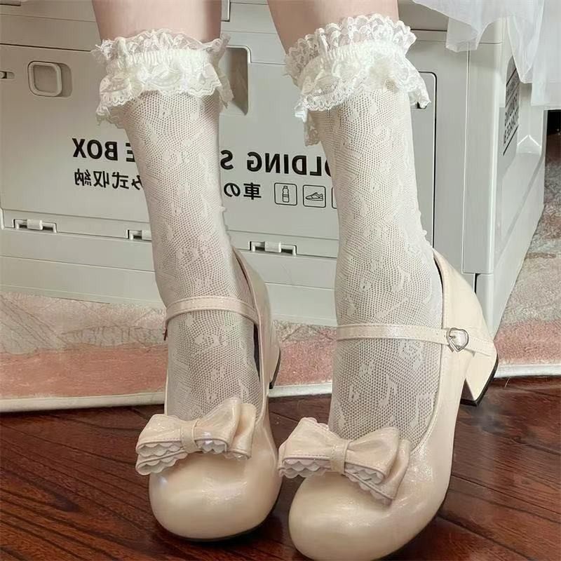 甜美蝴蝶结蕾丝单鞋女2026新款百搭Lolita圆头中跟粗跟高跟小皮鞋