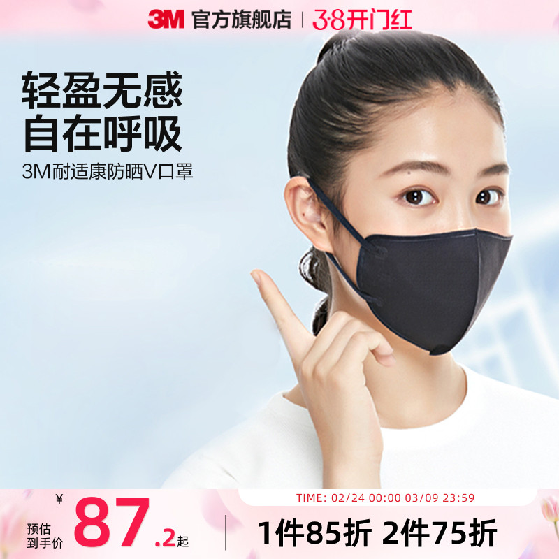 3M防晒口罩活性炭防护防紫外线显脸小除异味夏季立体黑色防风不勒