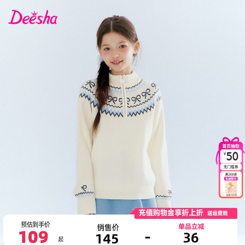 笛莎童装女童毛衣冬季新款中大童儿童时尚立领针织衫半拉链式外套