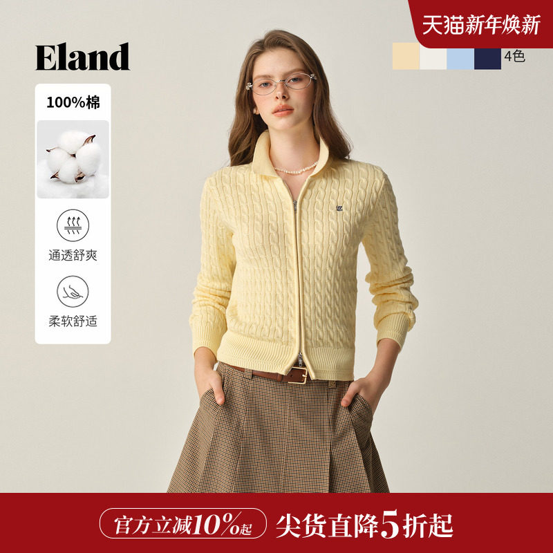 【100%棉】Eland衣恋毛针织衫女拉链开衫休闲毛衣2025冬季新款