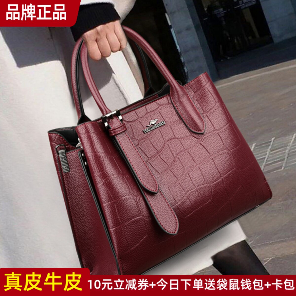 袋鼠真皮女包手提包斜挎包女式2025新款单肩包鳄鱼纹大容量包包女