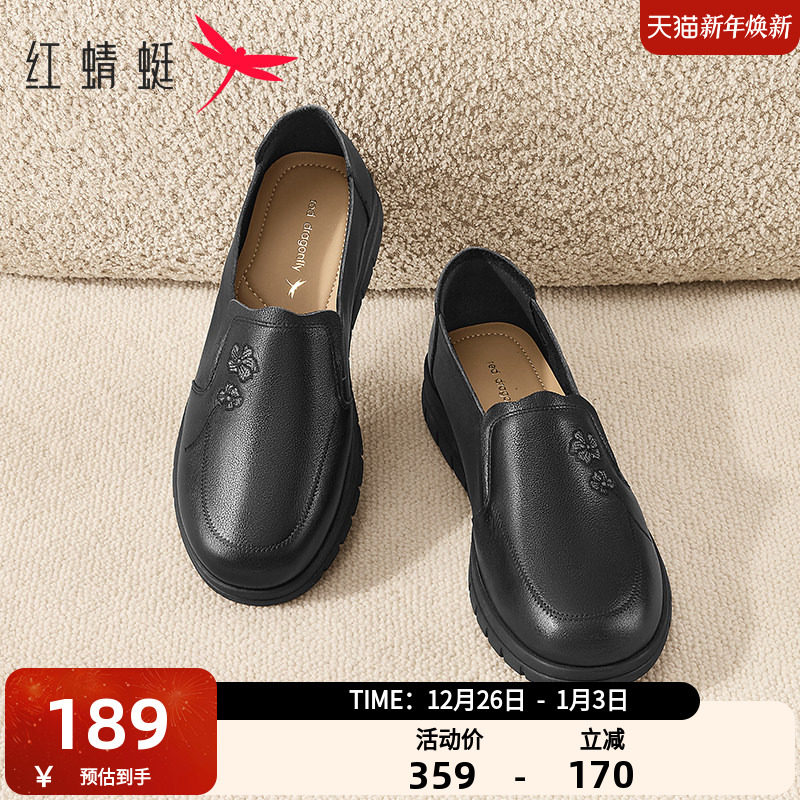 红蜻蜓官方正品红妈妈鞋春季款小皮鞋女中年真皮软底舒适防滑坡跟