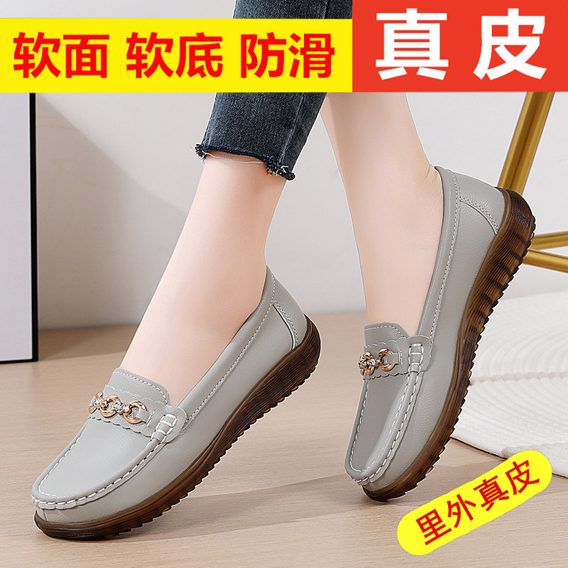 真皮妈妈鞋春季软底防滑单鞋中老年鞋女士皮鞋一脚蹬乐福豆豆鞋女