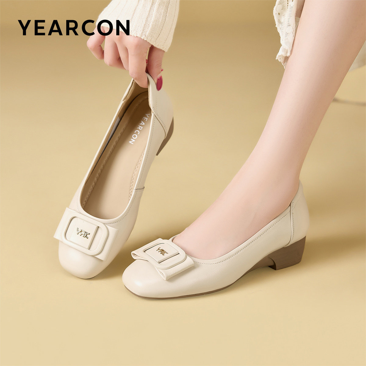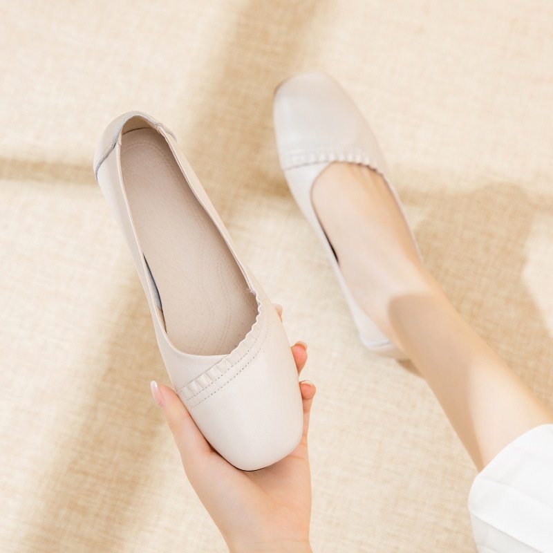 单鞋女士真皮软底妈妈鞋春季新款平底浅口方头奶奶四季米白色单鞋