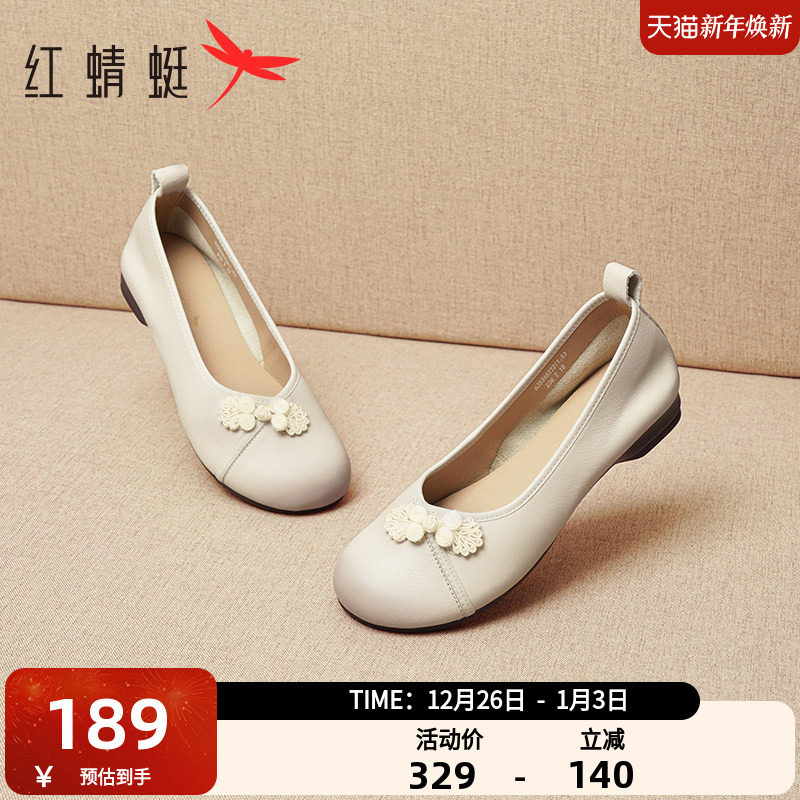 红蜻蜓新中式妈妈鞋春季新款女鞋中老年鞋子平底单鞋真皮软底皮鞋