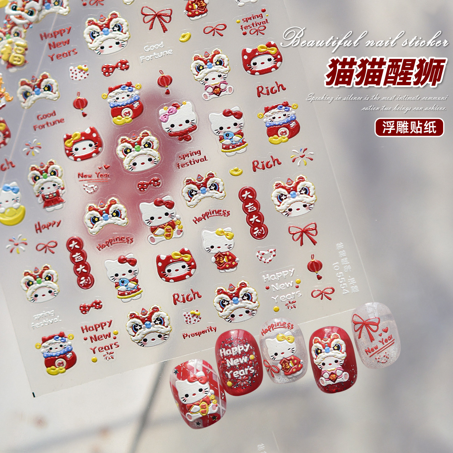 新年KT猫猫醒狮头套美甲贴纸2026马年新春喜庆发财卡通指甲装饰品