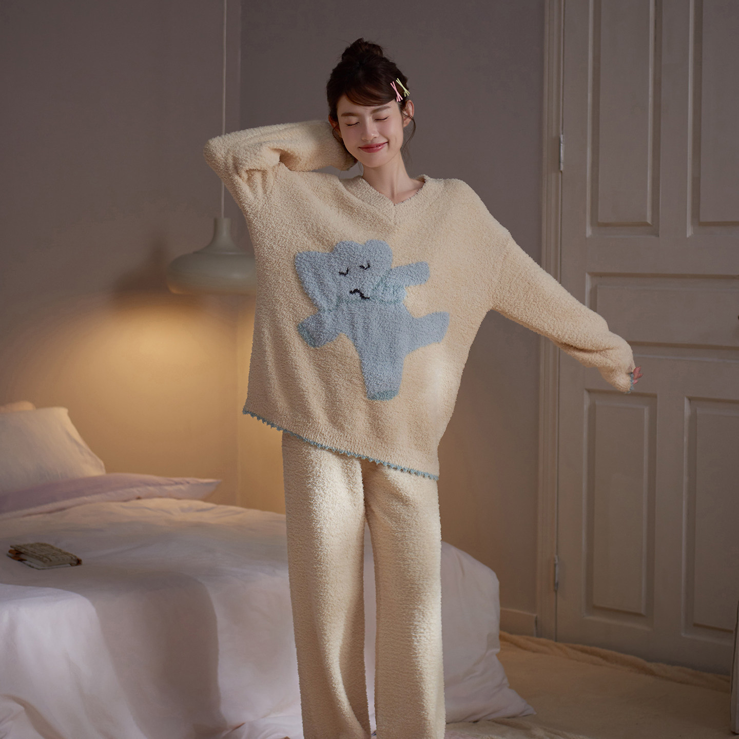 思莉太太半边绒睡衣女冬季加厚加绒甜美卡通小熊保暖可外穿家居服
