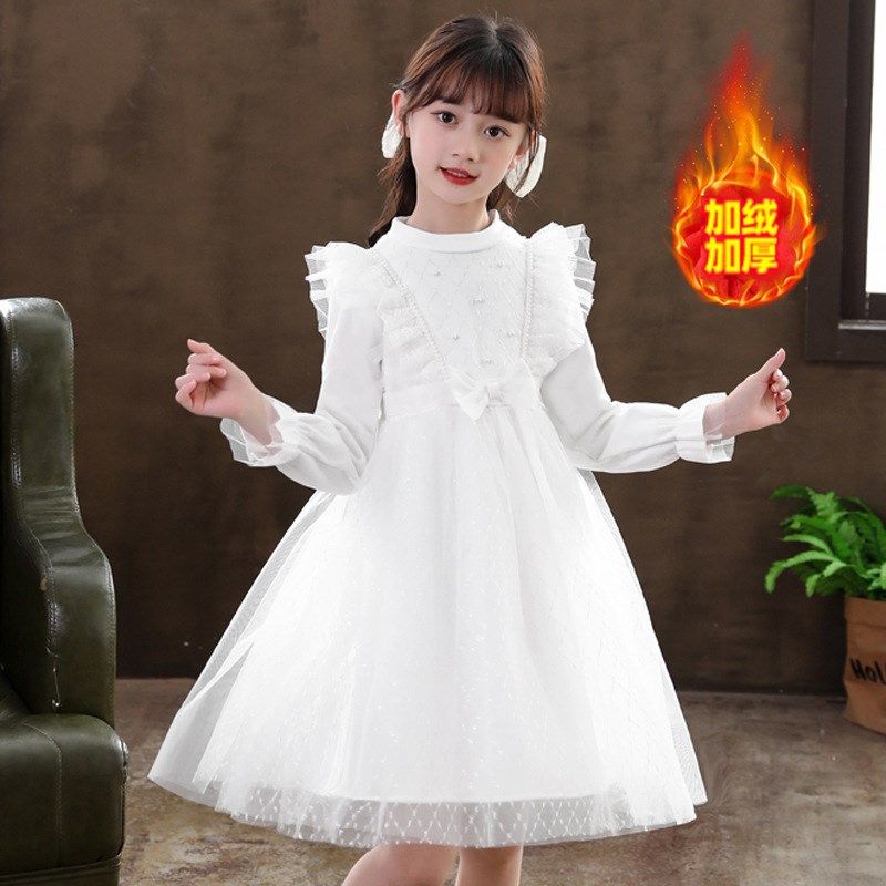 女童蕾丝粉色公主连衣裙2024秋冬新款女孩加绒洋气白色蓬蓬网纱裙
