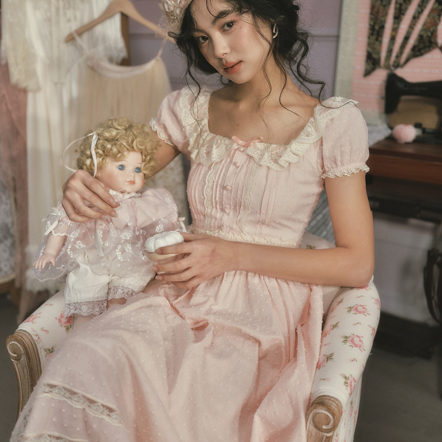 LaceMade 浓汤宝宝 法式甜美粉色公主裙蕾丝拼接方领长款连衣裙女