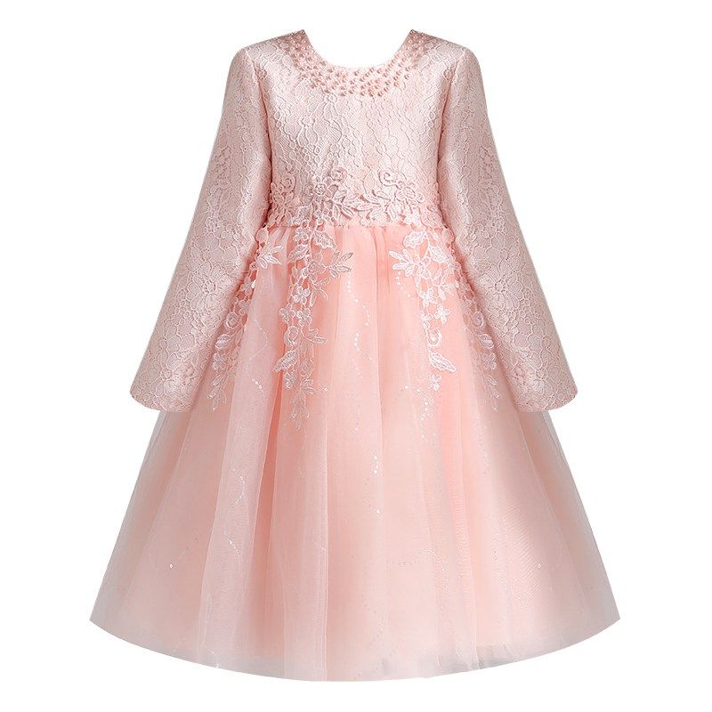 儿童长袖蓬蓬纱裙子女童粉色公主连衣裙女孩春秋冬中大童演出礼服