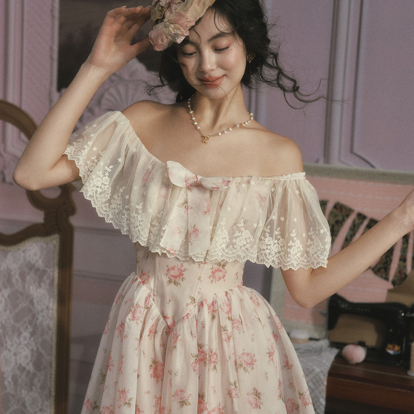 雪妮原创〈樱灵花姬〉粉色一字肩抹胸连衣裙浪漫法式仙女裙公主裙