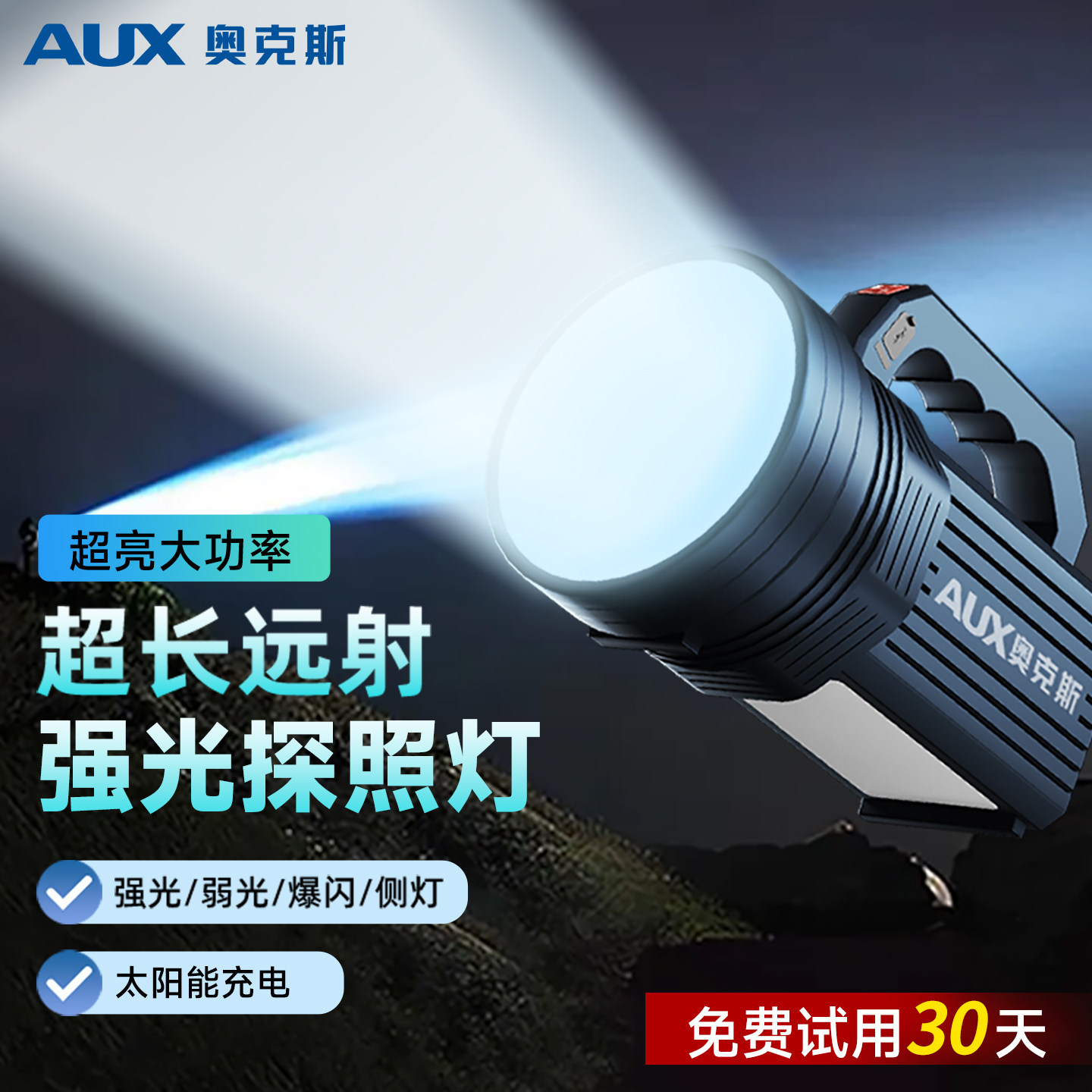 奥克斯手电筒强光充电超亮户外太阳能远射手提探照灯应急巡逻家用