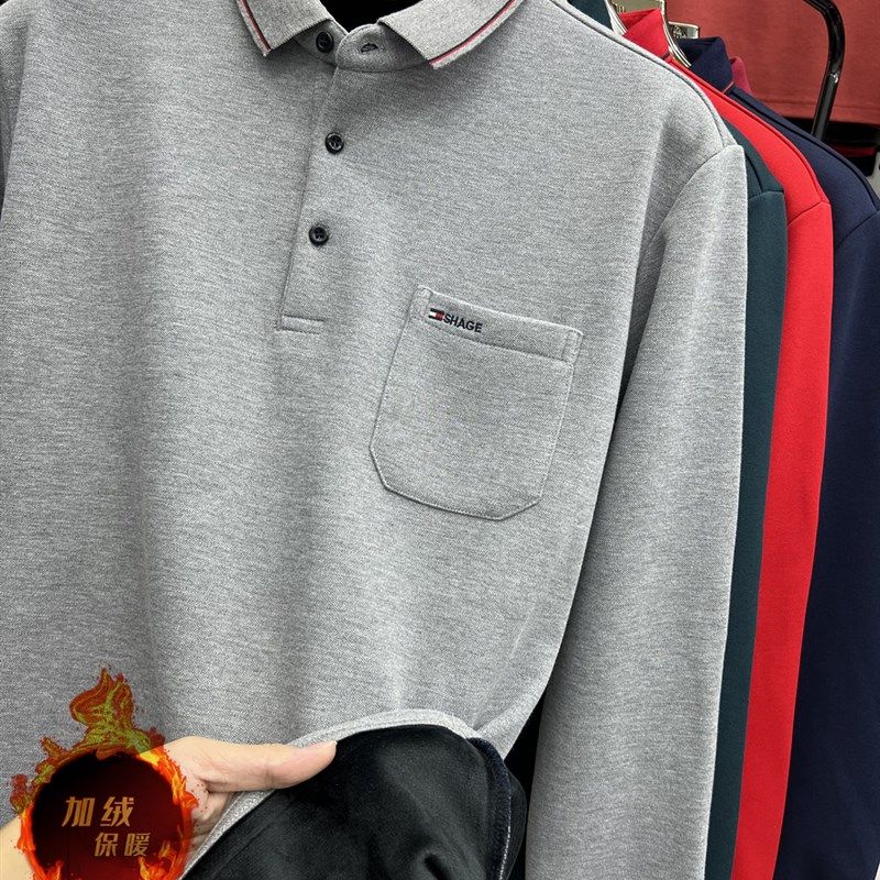 啄木鸟男士棉质长袖polo衫秋冬休闲宽松上衣中老年加绒翻领打底衫