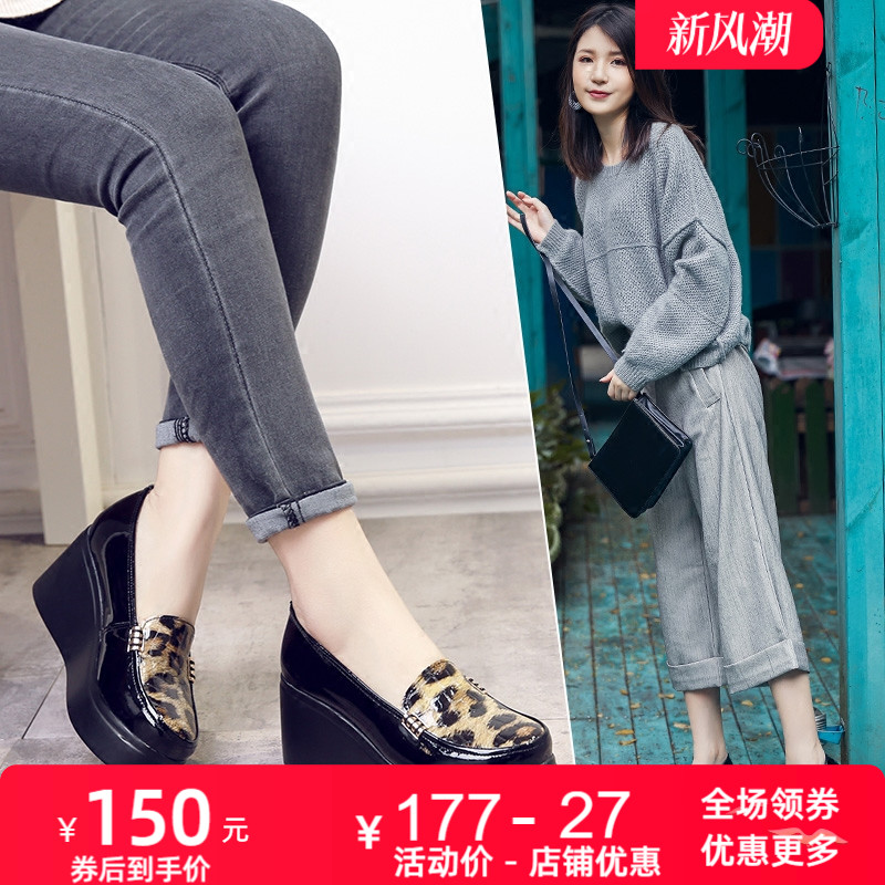 厚底时尚休闲鞋2025春新款牛漆皮豹纹真皮单鞋女高跟皮鞋增高女鞋