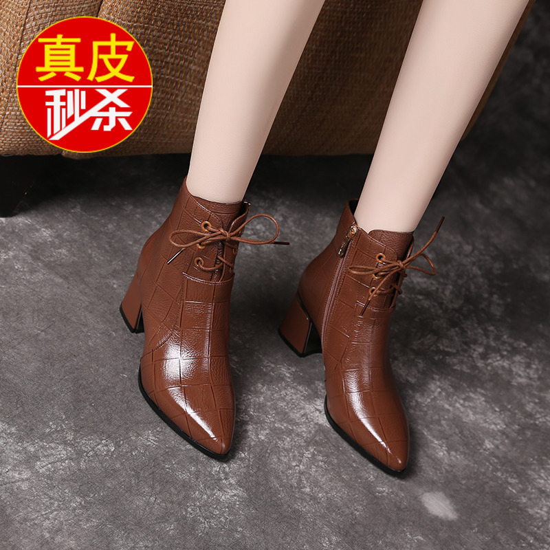 品牌鞋真皮单靴女2025年新款粗跟短靴高跟皮鞋冬季加绒尖头马丁靴