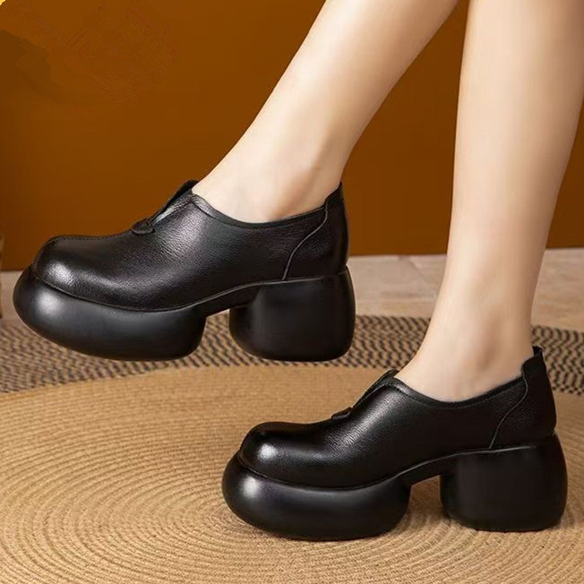 头层牛皮真皮单鞋厚底松糕底高跟皮鞋女鞋复古一脚蹬懒人鞋妈妈鞋